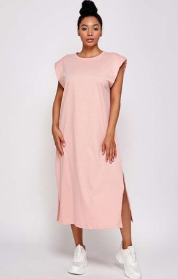 Oversized Muscle Tee Dress with shoulder pads and side slits. Belt not included. Size down for a more clingy fit.