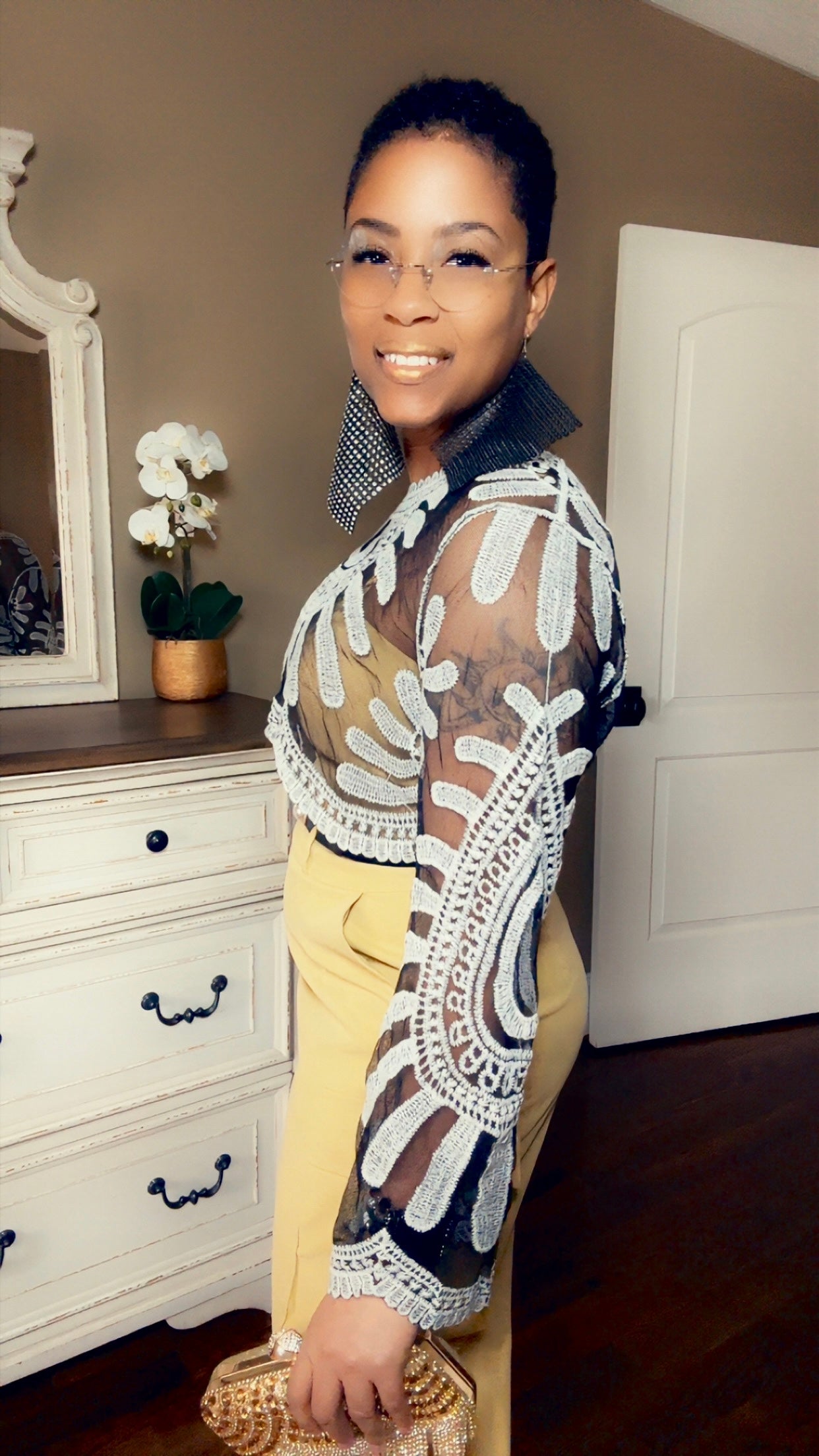 Black and white knitted embroidered sheer top. Size up for longer torso fit. Top is designed to be cropped. Model is wearing a medium with 5’4”, 28” waist measurements. This is a quick grab item. Sales final.